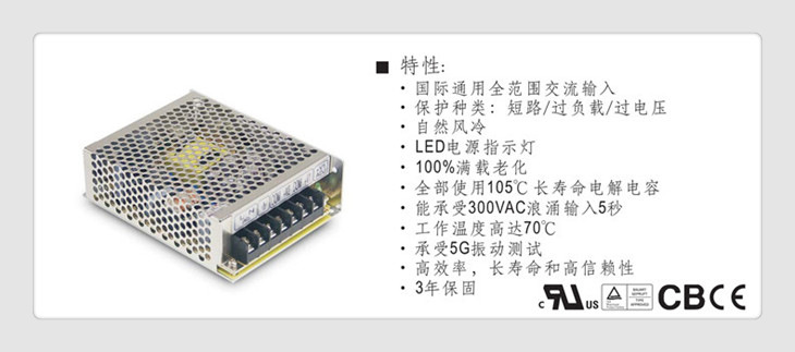 高可靠开关电源机型, 可承受5G震动与70°C高工作环温,全机使用105°C高寿命电解电容,可承受300VAC突波输入达5秒,适合使用于较严苛的工作环境