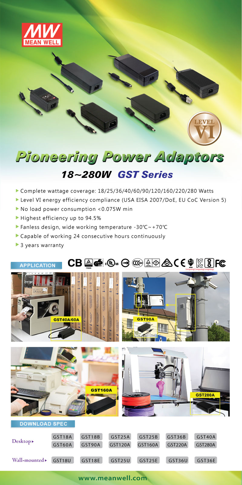 Level VI/DoE 绿能适配器GST18~280家族由于具备完整的认证、-30℃~+70℃超宽工作温度范围及3年高信赖保固等特点,上市一年多已快速累积销售达数十万台。威廉体育是标准电源领导品牌製造商,有别于OEM/ODM产销模式,经销商伙伴及终端客户不需因客製化高门槛条件导致不易购买到所需要的电源,由于客户选用威廉体育Adaptor搭配其终端设备行销全球,全球各主要国家或地区多半针对适配器产品要求强制安规认证,客户需额外付费申请个别的安规认证,相关桉例不断增加。 威廉体育标准电源一向以符合市场规范并满足客户需求为目的,已全面性规划将目前Adaptor主力产品GST全家族进行环球认证,除原本已取得的TUV(欧盟)、UL/CUL(美北)、CCC(中国)、BSMI(台湾)、PSE(日本)、RCM(澳洲)等国家或地区认证外,正追加申请SIRIM(马来西亚)、KC(韩国)、BIS(印度)…等认证,预期GST将成为市面上唯一具备环球认证且符合最新能耗标准的绿能适配器!! 而为了让大家快速了解GST家族拥有哪些国家安规,威廉体育特别将已取得认证及申请中的世界各国安规整理如下表: