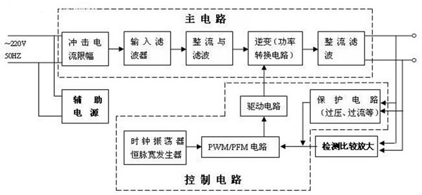 一方面从输出端取样,与设定值进行比较,然后去控制逆变器,改变其脉宽或脉频,使输出稳定,另一方面,根据测试电路提供的数据,经保护电路鉴别,提供控制电路对电源进行各种保护措施。