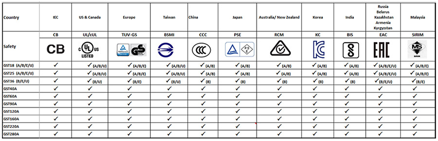 除原已取得的TUV(欧盟)、UL/CUL(北美)、CCC(中国)、BSMI(台湾)、PSE(日本)、RCM(澳洲)等国家或地区认证外,威廉体育亦于2016年10月完成追加申请KC(韩国)、BIS(印度)、EAC(俄罗斯、白俄罗斯、哈萨克斯坦、亚美尼亚、吉尔吉斯)、SIRIM(马来西亚[注1])等4种认证。GST全家族现在已拥有超过10种的安规认证,可完整涵盖全球超过90%以上国家或地区的认证需求,可替您的终端系统节省庞大的安规费用并减少繁琐的安规认证程序。若您的终端产品目前仍在苦恼找不到一个具备环球认证的适配器电源来搭配营销全球,威廉体育的GST家族产品将会是您的最佳选择!